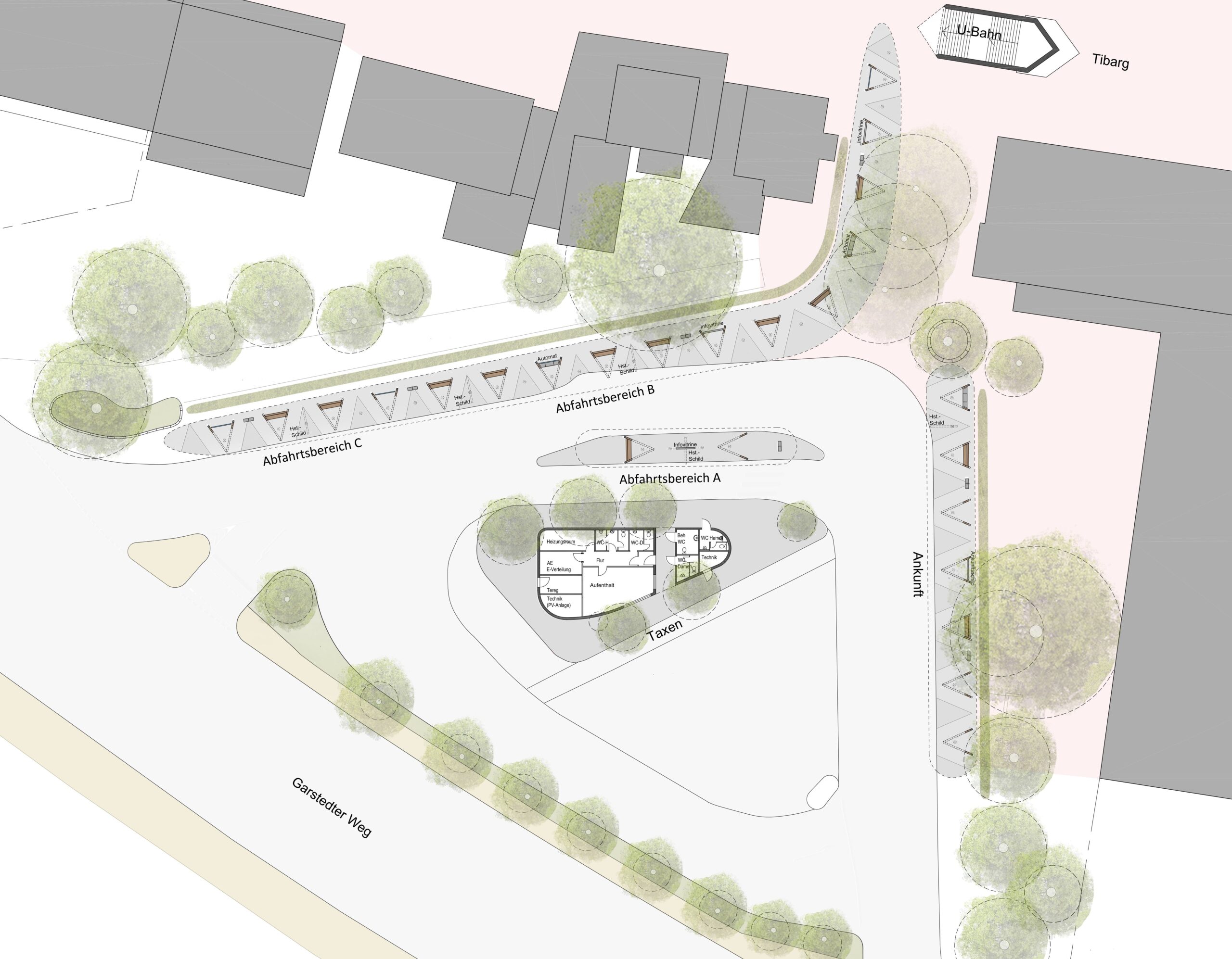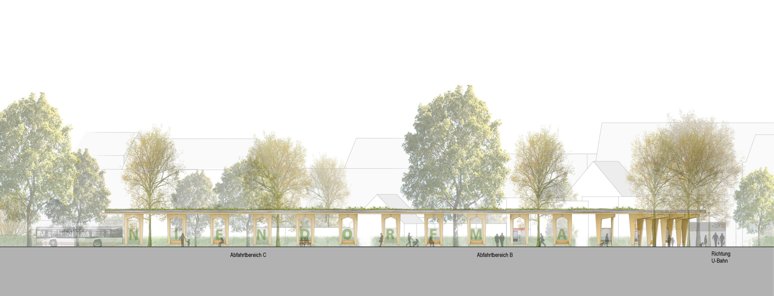 Wettbewerb- Busumsteigeanlage Niendorf Markt Umgestaltung der Busumsteigeanlage mit 13 Busanlagen der HOCHBAHN. 15. April 2026 By WIRSIND Architekten und Stadtplaner Auftraggeber Hamburger Hochbahn AGPlanung 2025Realisierung nicht realisiert Ansicht Hauptdach Grundriss Lageplan Detail Dachkonstruktion